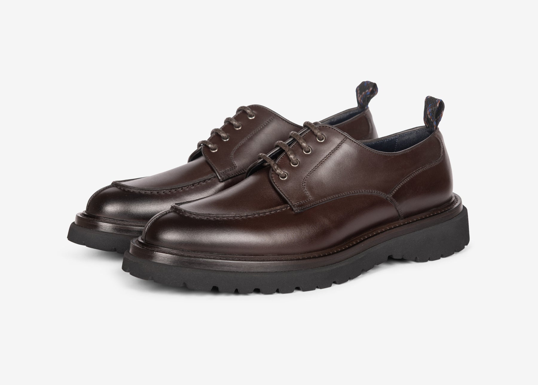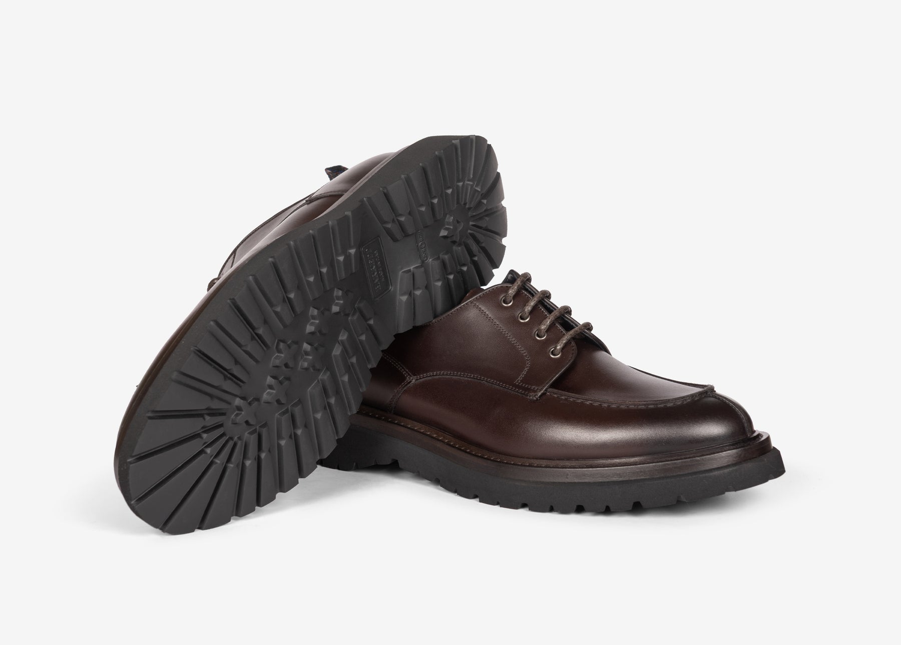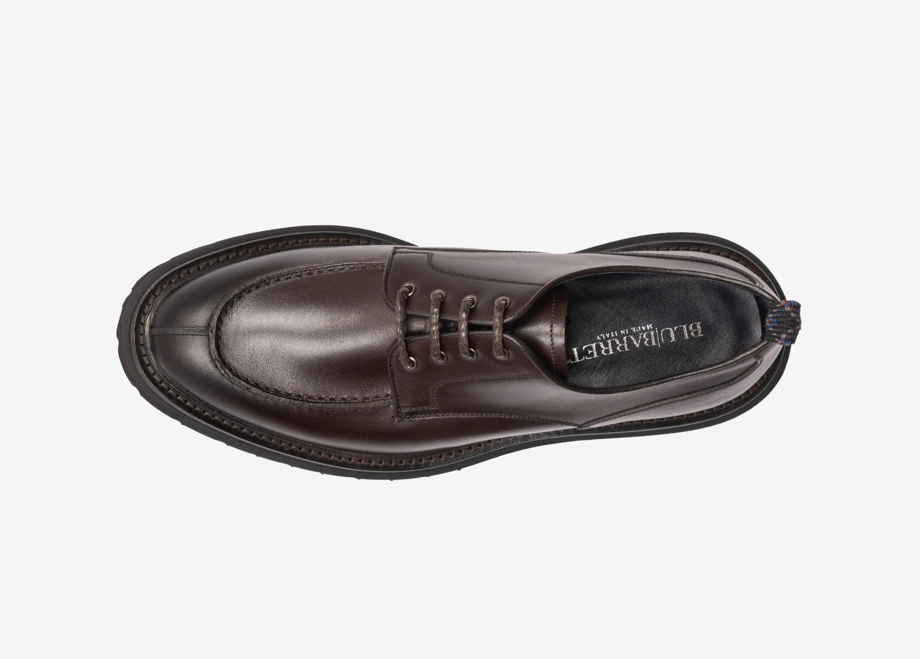 Derby con cucitura sulla tomaia, in morbidissima pelle di vitello. La suola voluminosa con battistrada carrarmato conferisce un look sportivo a questo modello evergreen che si adatta a tutti gli outfit più casual.