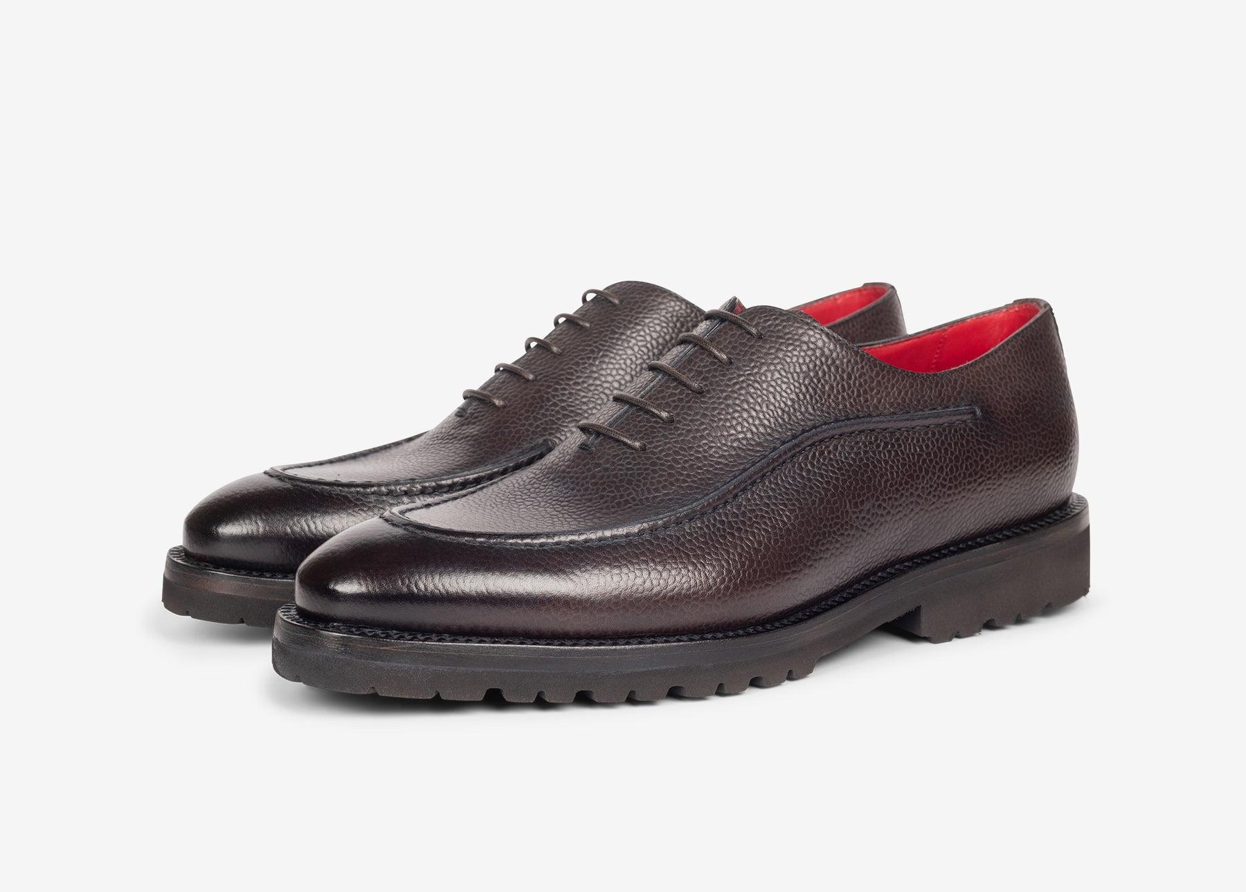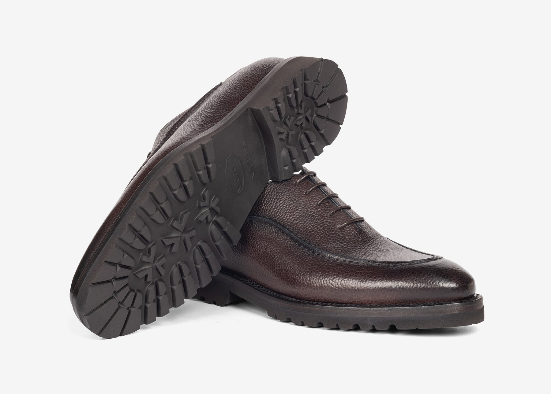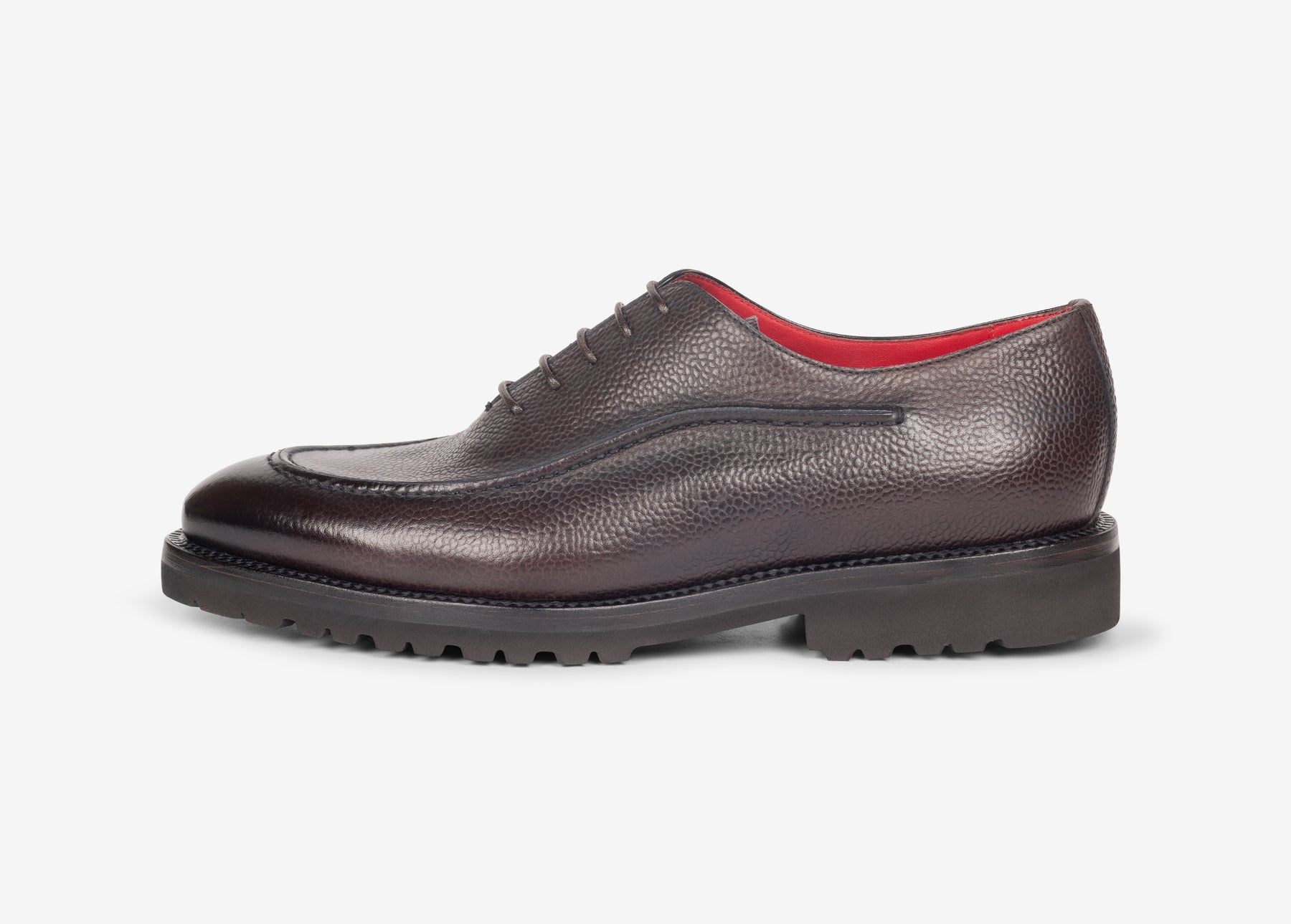 Oxford in vitello martellato e abbinato a una suola carrarmato. E' un pezzo unico e ricercato per il guardaroba del vero dandy. La particolarità di questo modello è la cucitura adler e il comfort dato dalla forma.