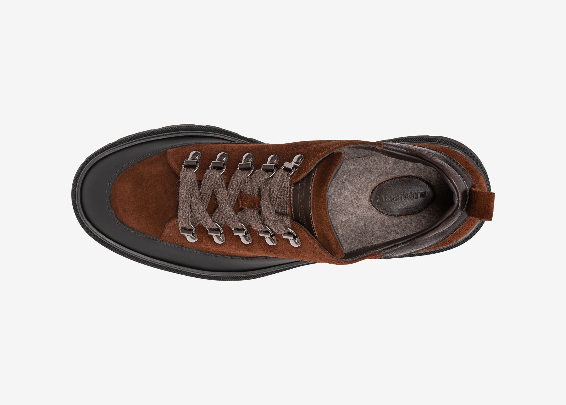 Scarponcino di ispirazione hiking. La tomaia è in vitello gommato e suede ingrassato, impreziosita da dettagli in cervo. La fodera è in lana, adatta anche alle temperature più fredde. E’ una pedula adatta per un utilizzo all’aria aperta ma abbinabile anche ad outfit più casual chic.