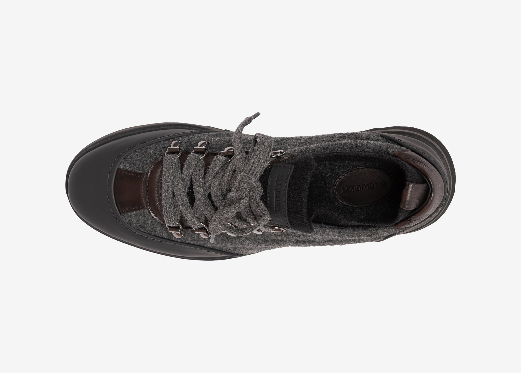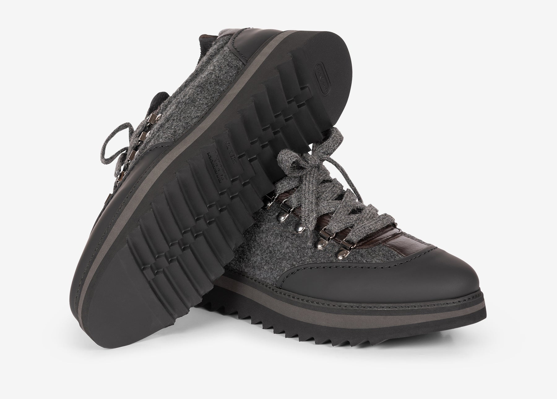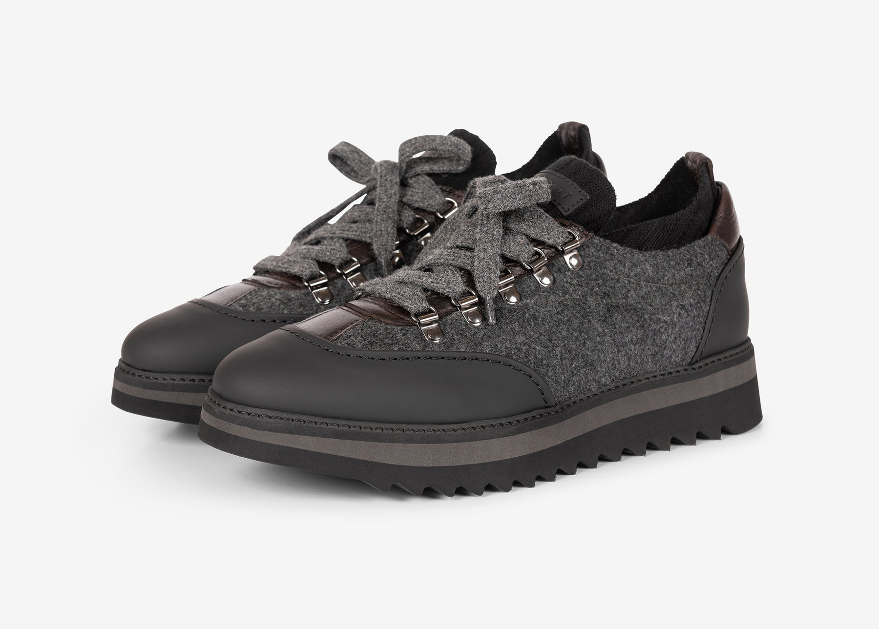 Sneaker di ispirazione hiking. La tomaia è realizzata abbinando diversi materiali, vitello gommato, lana e cervo. La fodera interna, anch’essa di lana, è adatta anche alle temperature più fredde. Il calzino interno alla tomaia facilita la calzata una volta regolata l’allacciatura.