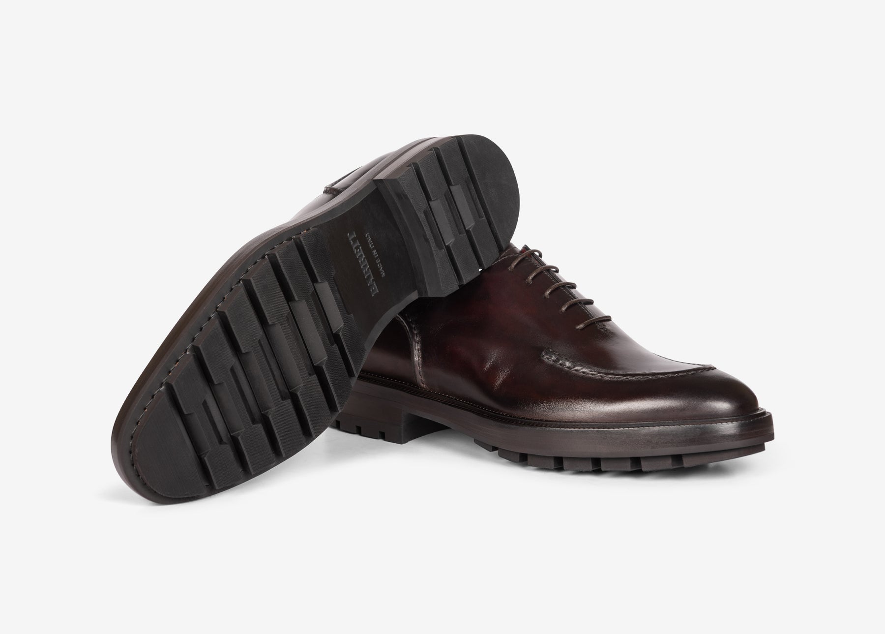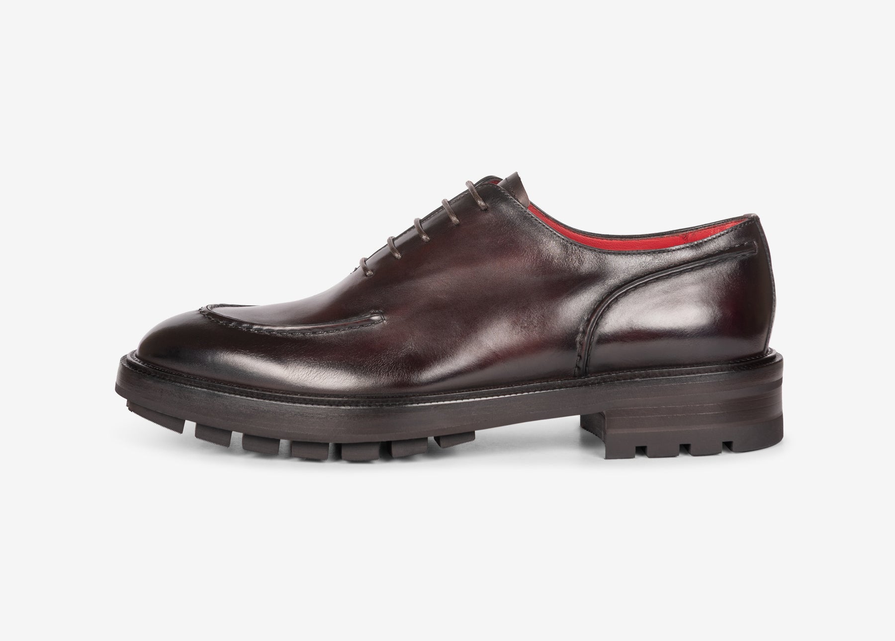 Oxford in vitello anticato a mano, color bordeaux. Un modello grintoso e trasversale risaltato dalla doppia suola e il battistrada in gomma. La calzatura è perfetta per i look casual-chic e per la stagione invernale.