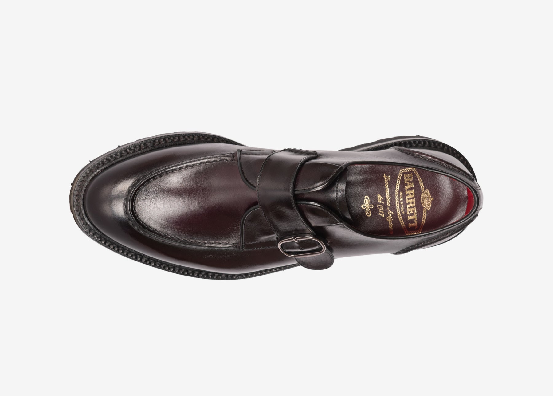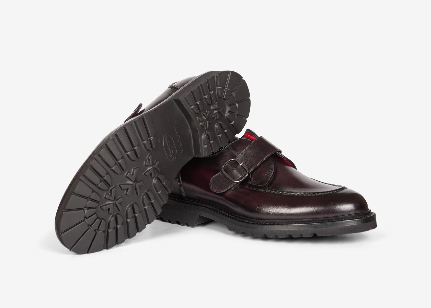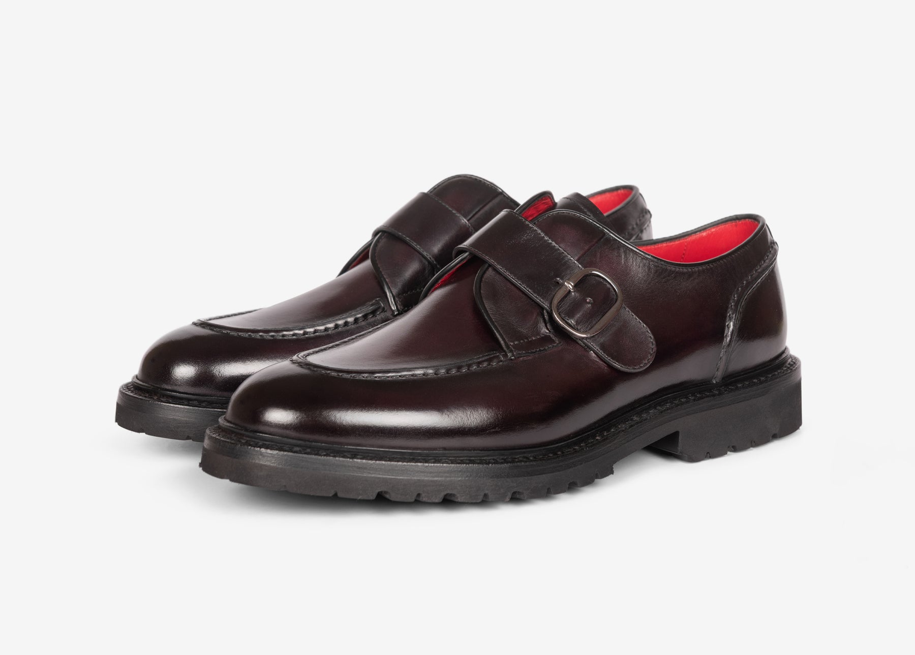 Single monk strap derby with stitched apron, crafted from hand-aged calfskin.