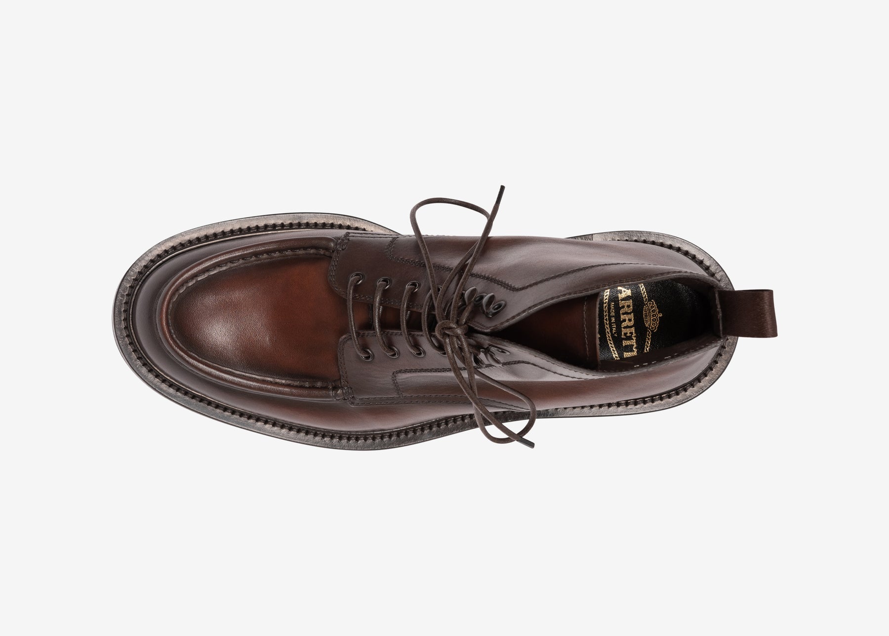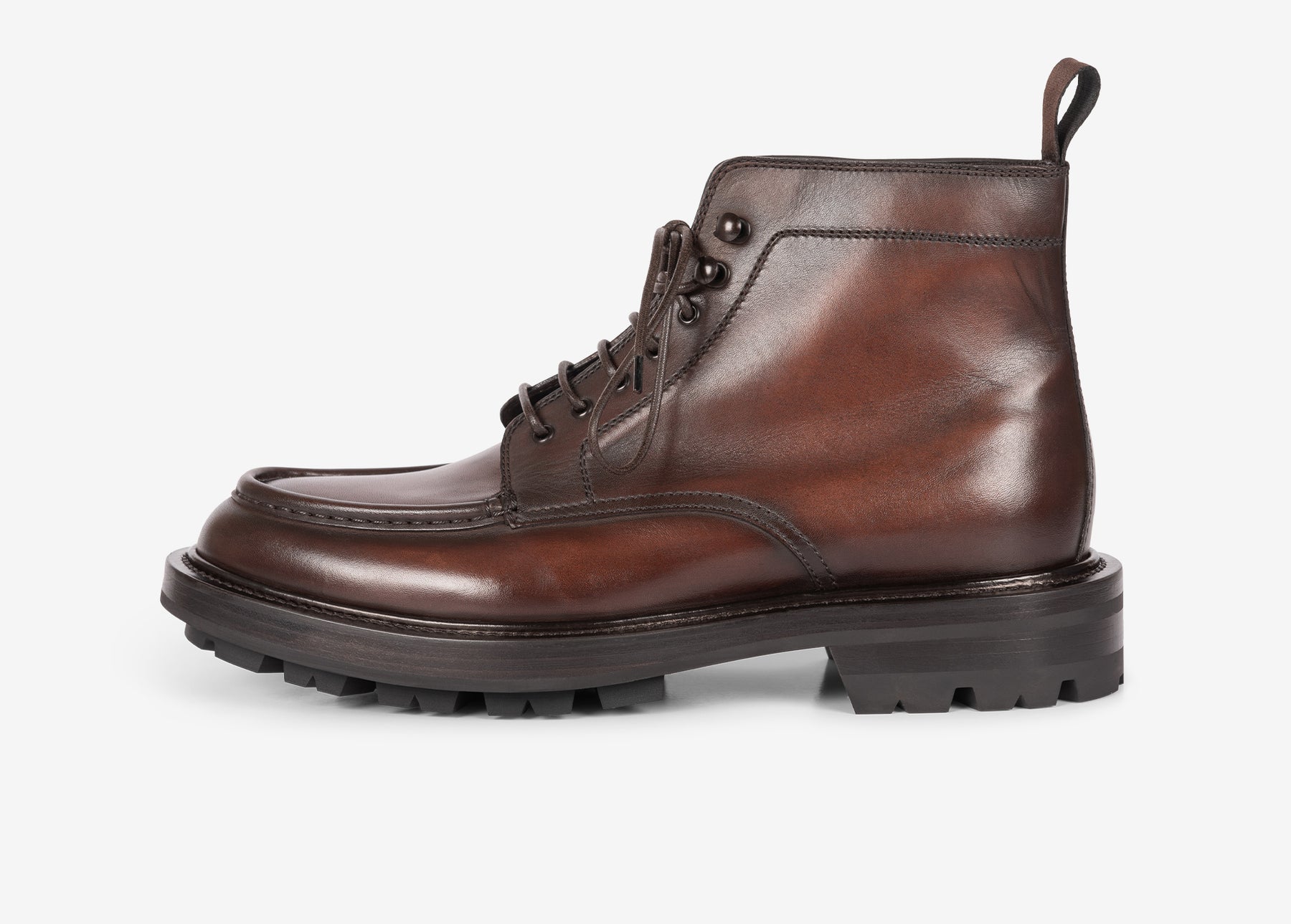 Ankle boot with hem tray made of hand-aged calfskin. The commando sole gives this master piece of the collection a strong and dynamic character suitable for any casual look for a day outdoors.